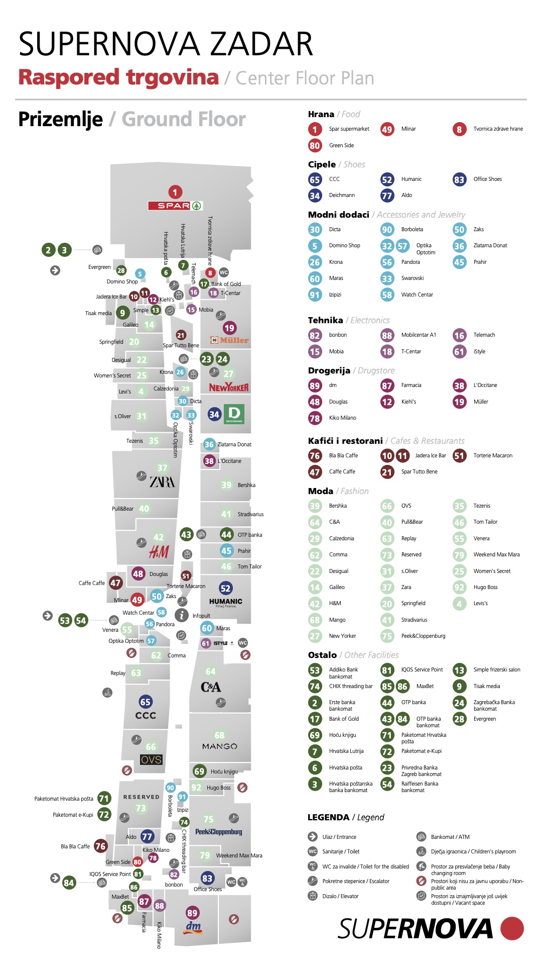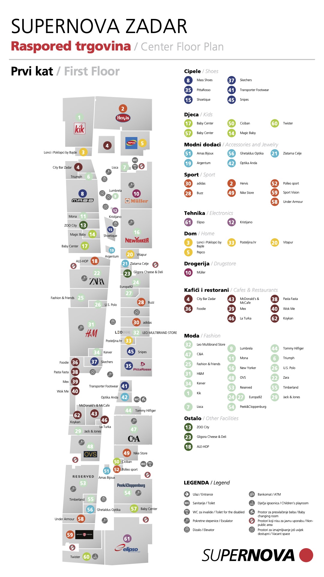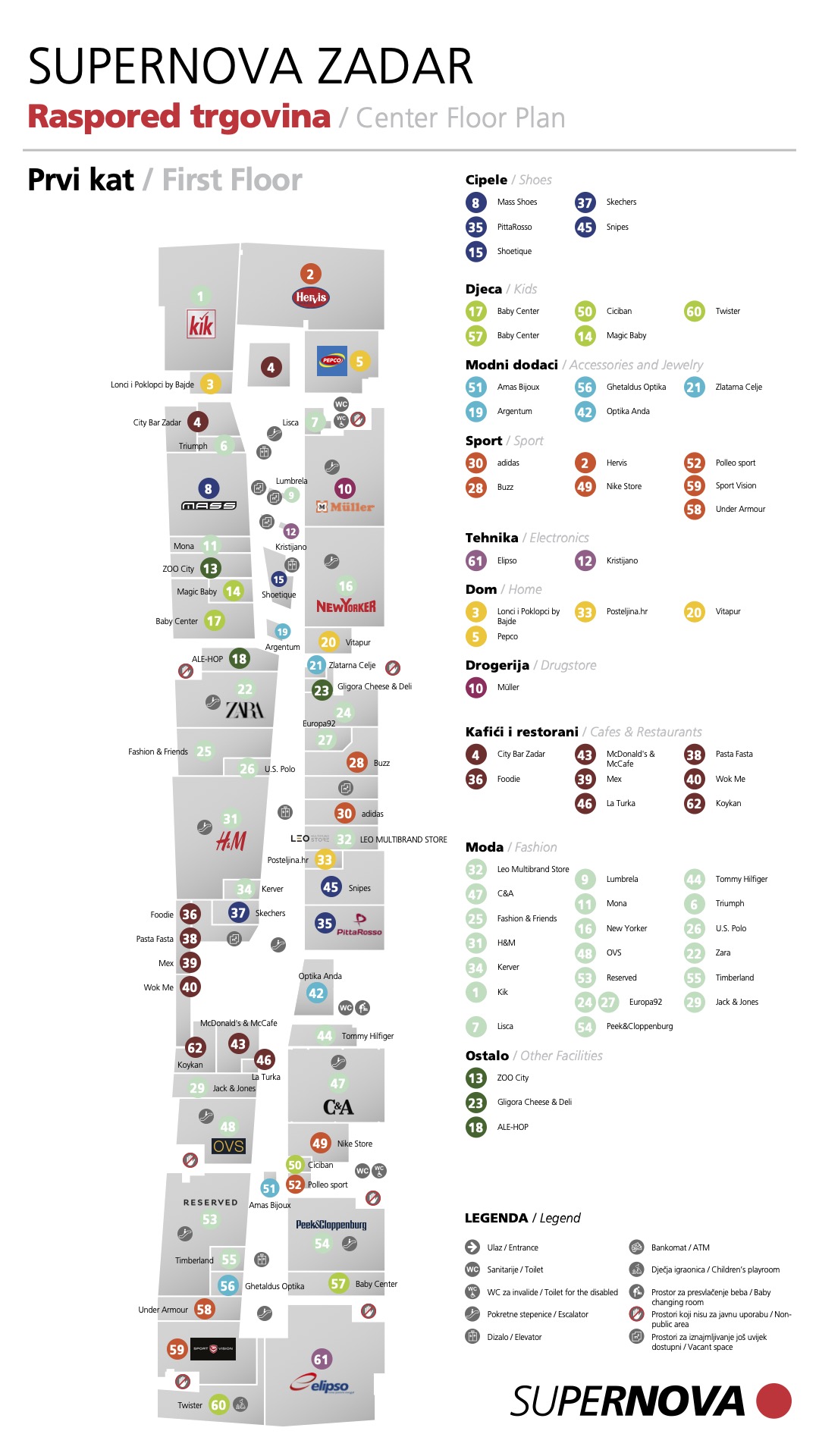Ovdje možete pogledati mapu shopping centra Supernova Zadar. Kliknite i provjerite naše trgovine i usluge!